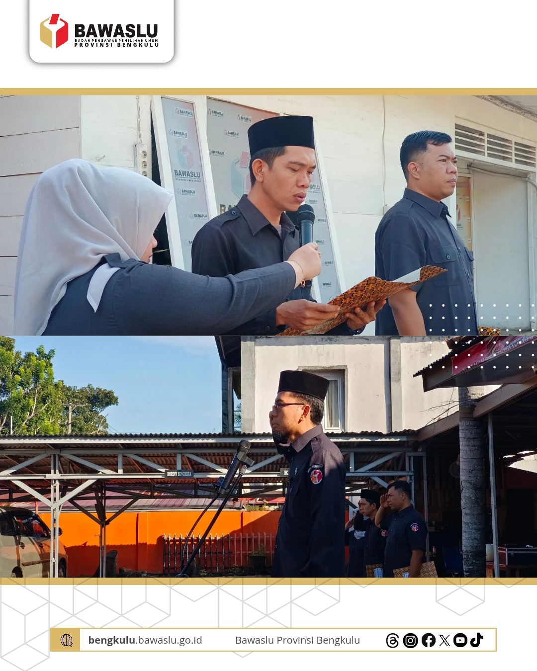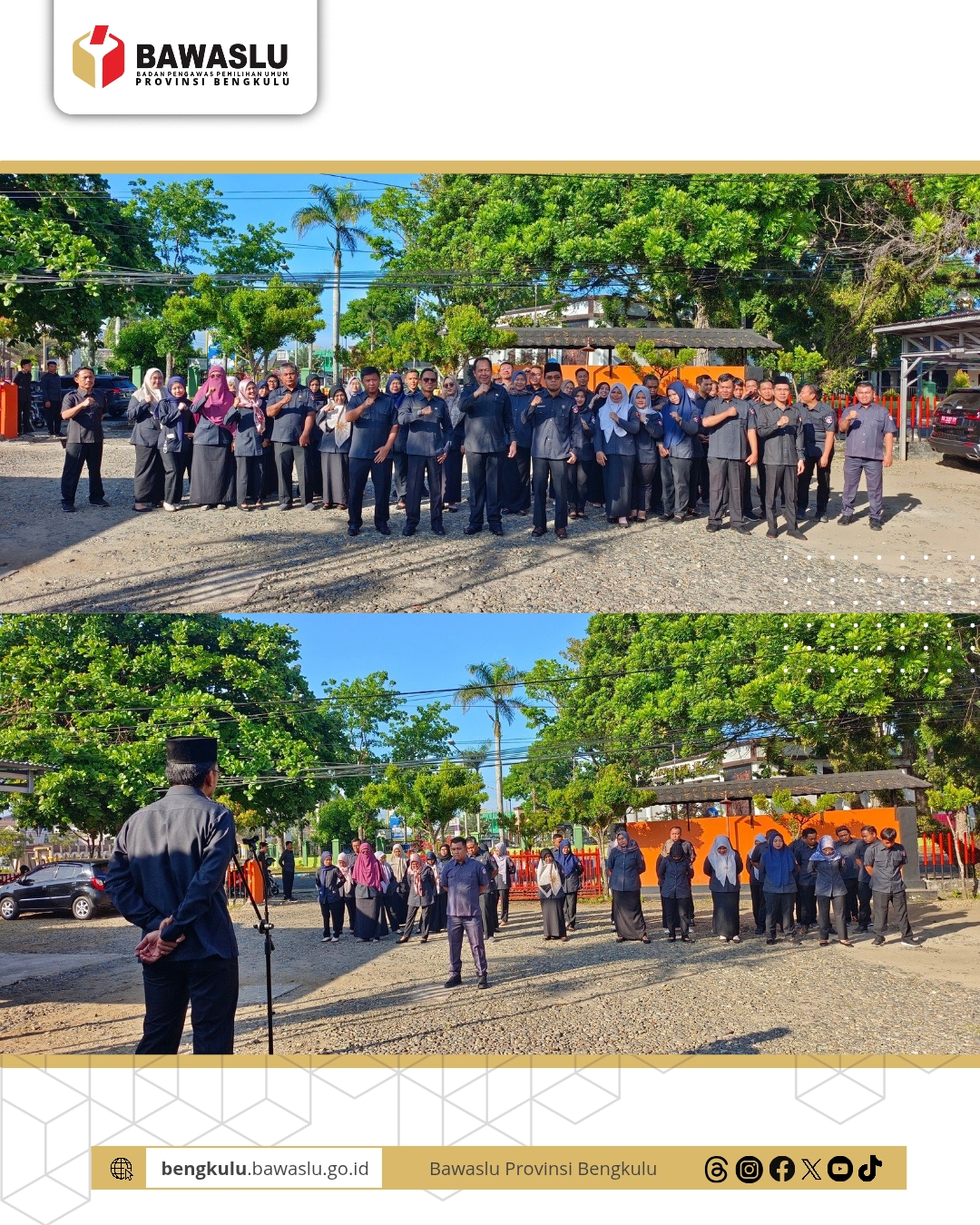 Bengkulu, Bawaslu Provinsi Bengkulu – Giat rutinan Bawaslu Provinsi Bengkulu, Apel pagi pekanan menjadi momentum untuk menyolidkan semangat jajaran Bawaslu Provinsi Bengkulu di halaman Kantor Bawaslu Provinsi Bengkulu, Senin (28/7). Hadir selaku pembina apel, Kabag PPHPSP Bawaslu Provinsi Bengkulu, Sholehin. Turut dihadiri Kepala Sekretariat, Kepala Bagian, Pejabat Fungsional dan staf Bawaslu Provinsi Bengkulu.