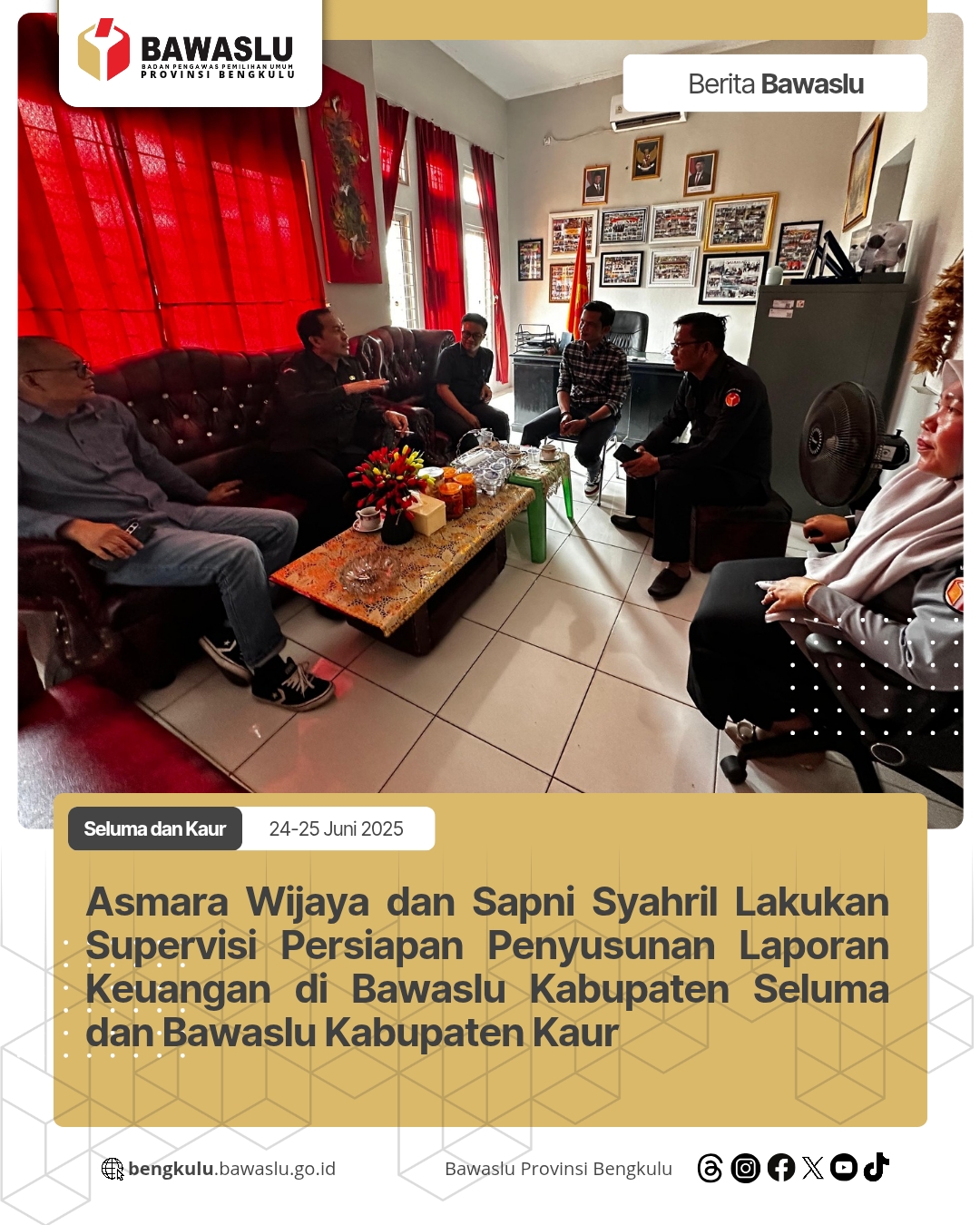 Seluma dan Kaur, Bawaslu Provinsi Bengkulu - Jelang akhir semester 1 tahun anggaran 2025, Bawaslu Provinsi Bengkulu melakukan supervisi persiapan penyusunan laporan keuangan semester 1 Tahun Anggaran 2025 di Sekretariat Bawaslu Kabupaten Seluma dan Sekretariat Bawaslu Kabupaten Kaur. Giat ini dilakukan oleh Anggota Bawaslu Provinsi Bengkulu Asmara Wijaya, Kepala Sekretariat Bawaslu Provinsi Bengkulu Bapak Sapni Syahril dan staf terkait. Giat berlangsung pada Selasa dan Kamis (24-25/06).