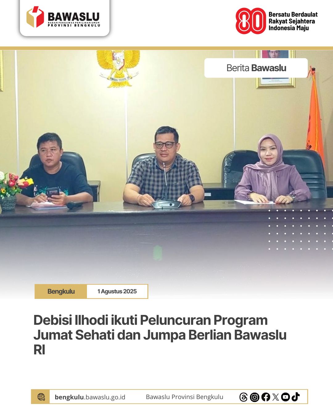 Bengkulu, Bawaslu Provinsi Bengkulu - Anggota Bawaslu Provinsi Bengkulu, Debisi Ilhodi didampingi Kabag Administrasi, Heru Kuswoyo dan staf mengikuti peluncuran Program Jumat Sehati (Jumat Menjaga Tubuh, Sehat Hati, Kuat Iman) dan Jumpa Berlian (Jujur, Menanam, Pelihara, Amankan, Bersih, Lingkungan dan Alam Nyata) yang digagas oleh Bawaslu RI. Giat ini dilaksanakan secara daring pada Jumat (01/08/2025). Peluncuran Jumat Sehati dan Jumpa Berlian ini diluncurkan langsung oleh Anggota Bawaslu RI, Herwyn Malonda.