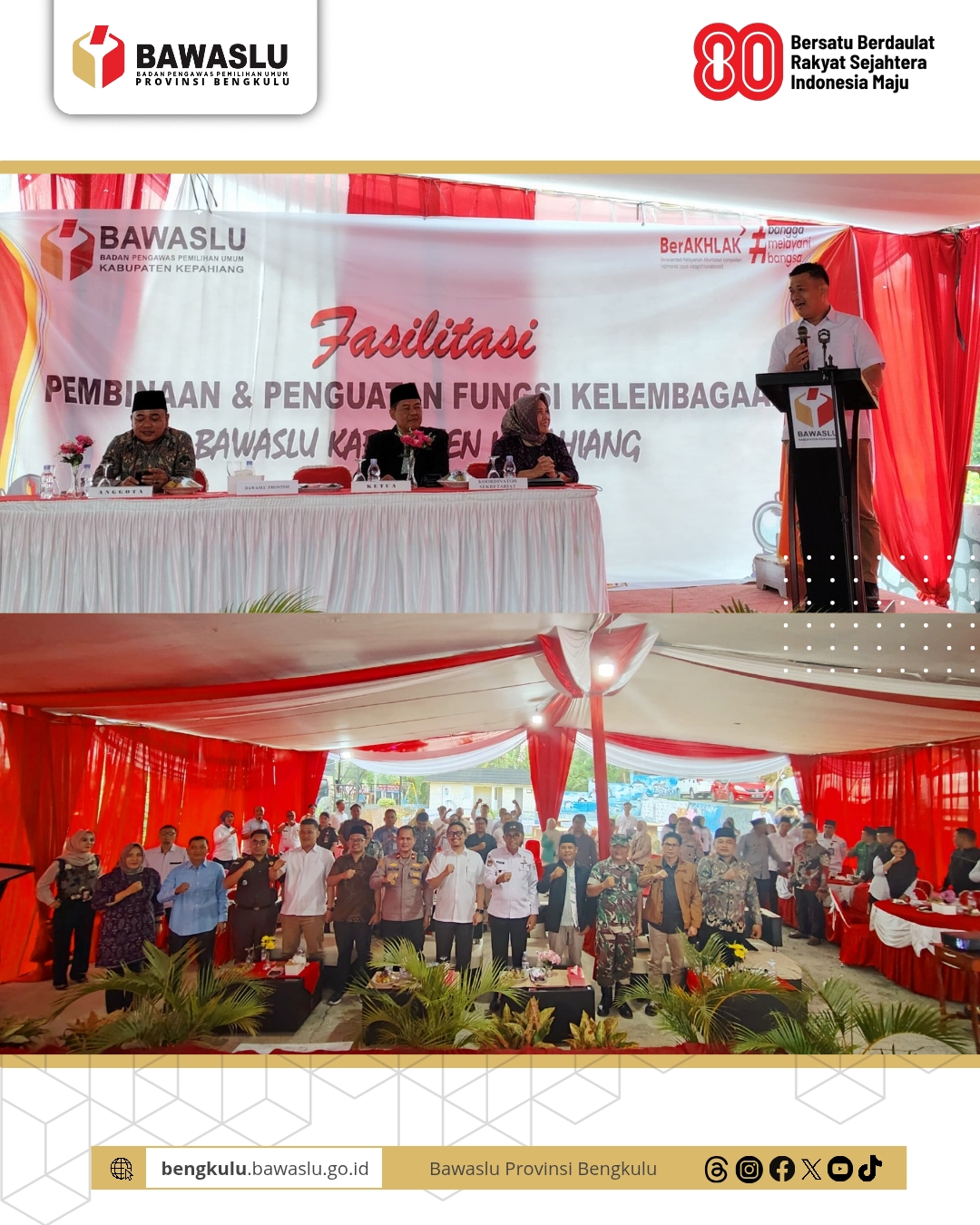 Kepahiang, Bawaslu Provinsi Bengkulu – Badan Pengawas Pemilihan Umum (Bawaslu) Kabupaten Kepahiang melaksanakan kegiatan Fasilitasi Pembinaan dan Penguatan Fungsi Kelembagaan. Kegiatan yang dilaksanakan selama 2 (dua) hari pada 3-4 September 2025 ini dihadiri kurang lebih 60 peserta diantaranya Ketua dan Anggota Bawaslu Kepahiang, KPU Kepahiang, Wakil Bupati Kepahiang, Polres Kepahiang, Dandim 0409 Kepahiang, Kejari Kepahiang, Forkompimda Kabupaten Kepahiang, Sekretariat Bawaslu Kabupaten Kepahiang, Organisasi Kemahasiswaan, LSM, serta perwakilan universitas di Kabupaten Kepahiang. Rabu (3/9/2025).
