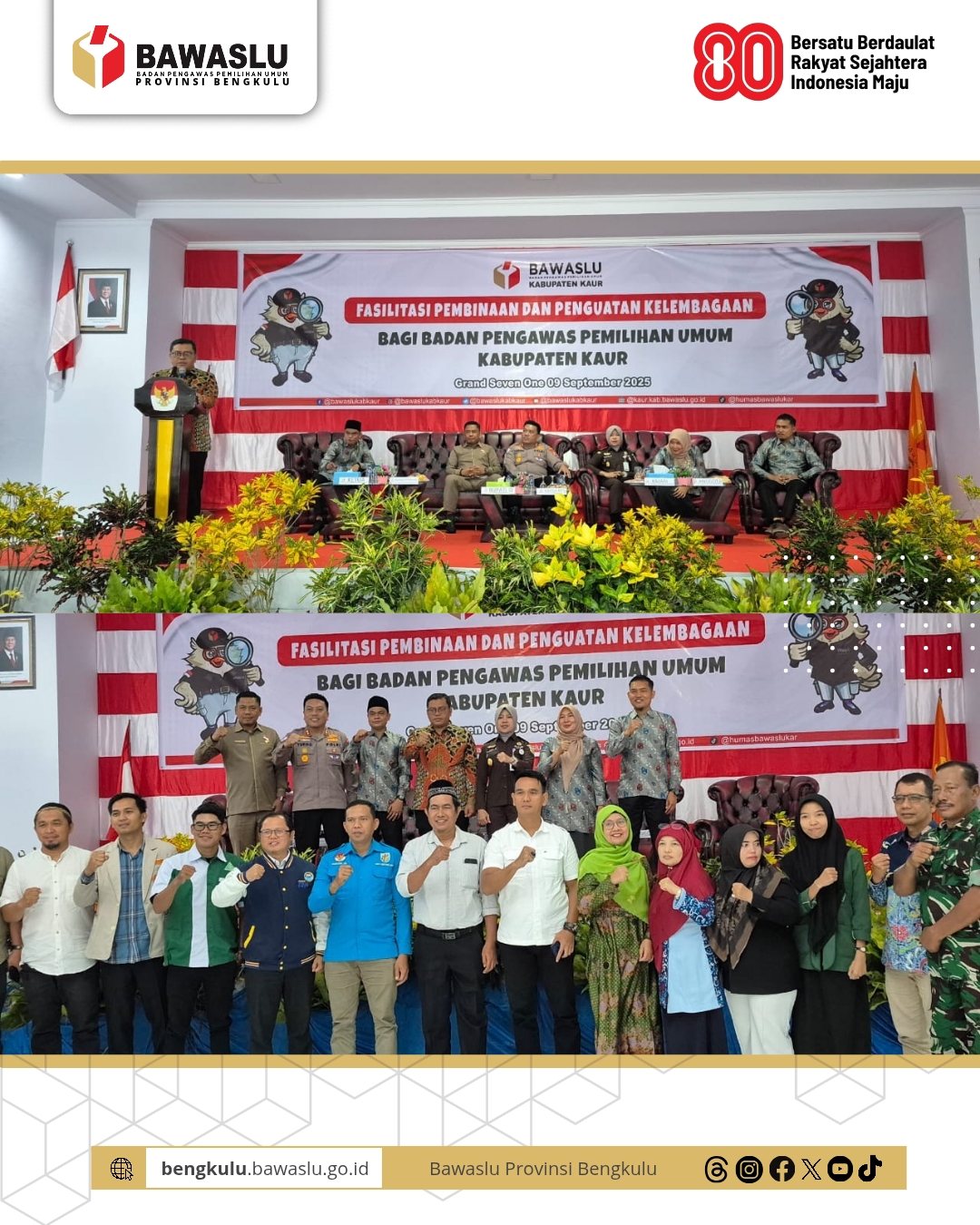 Kegiatan Fasilitasi Pembinaan dan Penguatan Kelembagaan Bagi Bawaslu Kabupaten Kaur yang dilaksanakan di Hotel Grand Seven One, dihadiri oleh Kapolres Kaur, Kajari Kaur dan Bupati Kaur yang diwakili oleh Asisten I Pemkab Kaur. Sebagaimana dalam sambutan yang disampaikan Ketua Bawaslu Kaur Muslihuddin, dan laporan mewakili Ketua Panitia Frengki Sufrianto, Kapolres Kaur, AKBP. Yuriko Fernanda, S.H., S.IK., M.H dan Kajari Kaur Dr. Jainah, S.H., M.H menjadi pemateri Efektivitas Peran Sentra Gakkumdu Kaur dalam Pemilu dan Pemilihan Serentak Tahun 2024, dan akademisi Universitas Bengkulu, Dr. Alfarabi, S.Sos., M.A menjadi pemateri Evaluasi Pengawasan Pemilu dan Pemilihan.