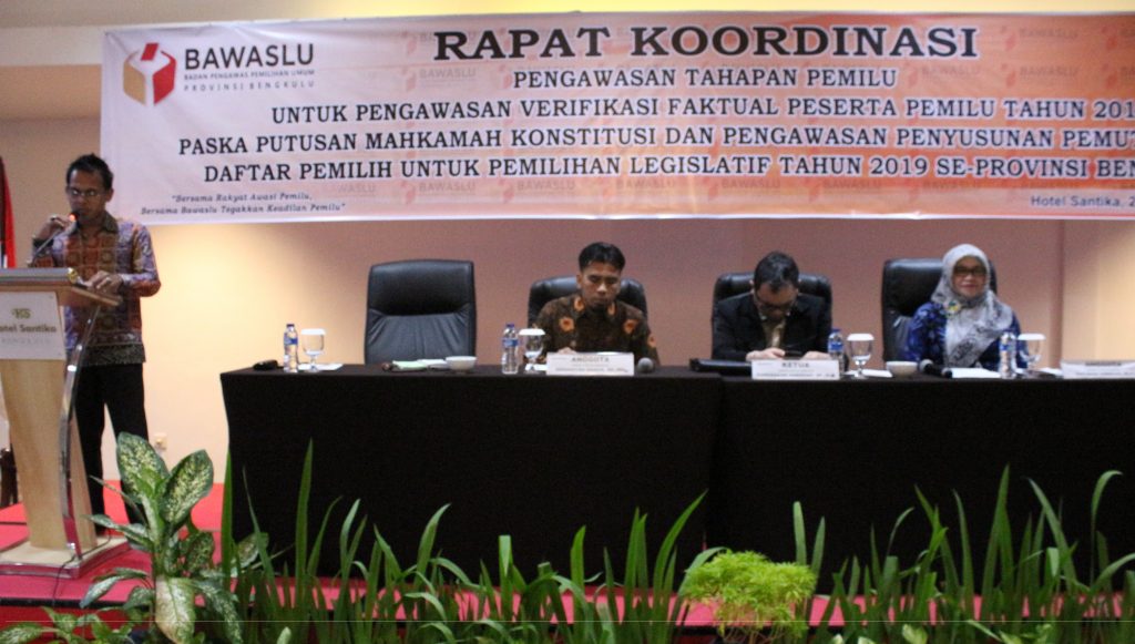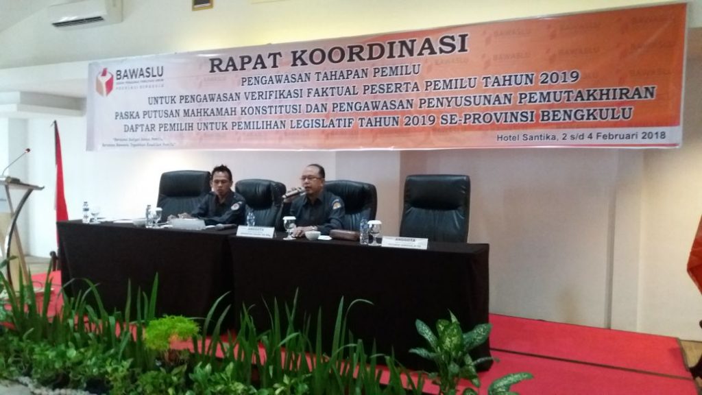 Bengkulu, Jumat (19/01/2018), Panwaslu Kota Bengkulu, melaksanakan Kegiatan "Rapat Koordinasi Pengawasan Tahapan Pemilu Untuk Pengawasan Verifikasi Faktual Peserta Pemilu Tahun 2019 Paska Putusan Mahkamah Konstitusi Dan Pengawasan Penyusunan Pemuktahiran Daftar Pemilih Untuk Pemilihan Legislatif Tahun 2019 Se- Provinsi Bengkulu"Â Yang Bertempat di Hotel Santika Bengkulu.