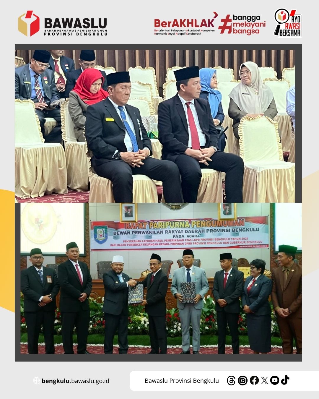 Bengkulu, Bawaslu Provinsi Bengkulu - Memenuhi undangan DPRD Provinsi Bengkulu, Bawaslu Provinsi Bengkulu diwakili Kepala Sekretariat, Sapni Syahril mengikuti sidang paripurna dengan agenda penyampaian laporan hasil pemeriksaan oleh badan pemeriksaan keuangan pada Senin (26/5), Pemerintah Provinsi Bengkulu berhasil meraih predikat Wajar Tanpa Pengecualian dengan paragraf Penekanan Suatu Hal (WTP PSH).