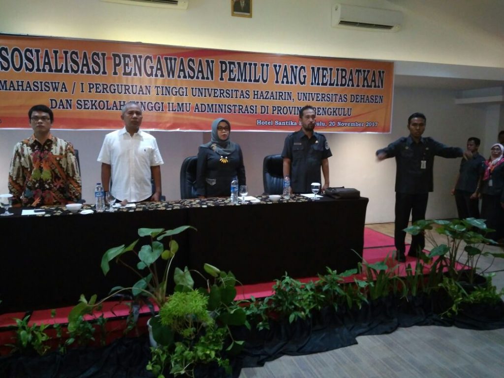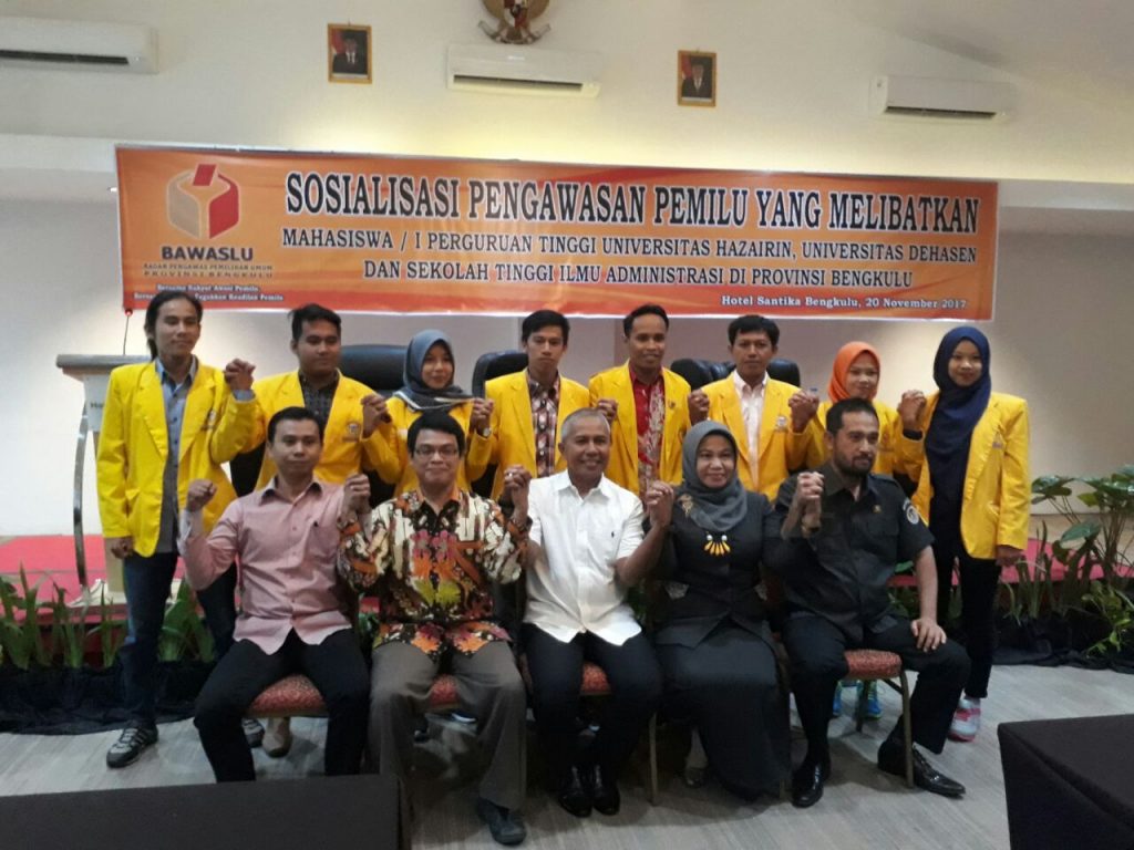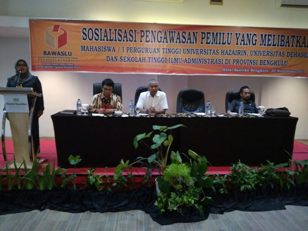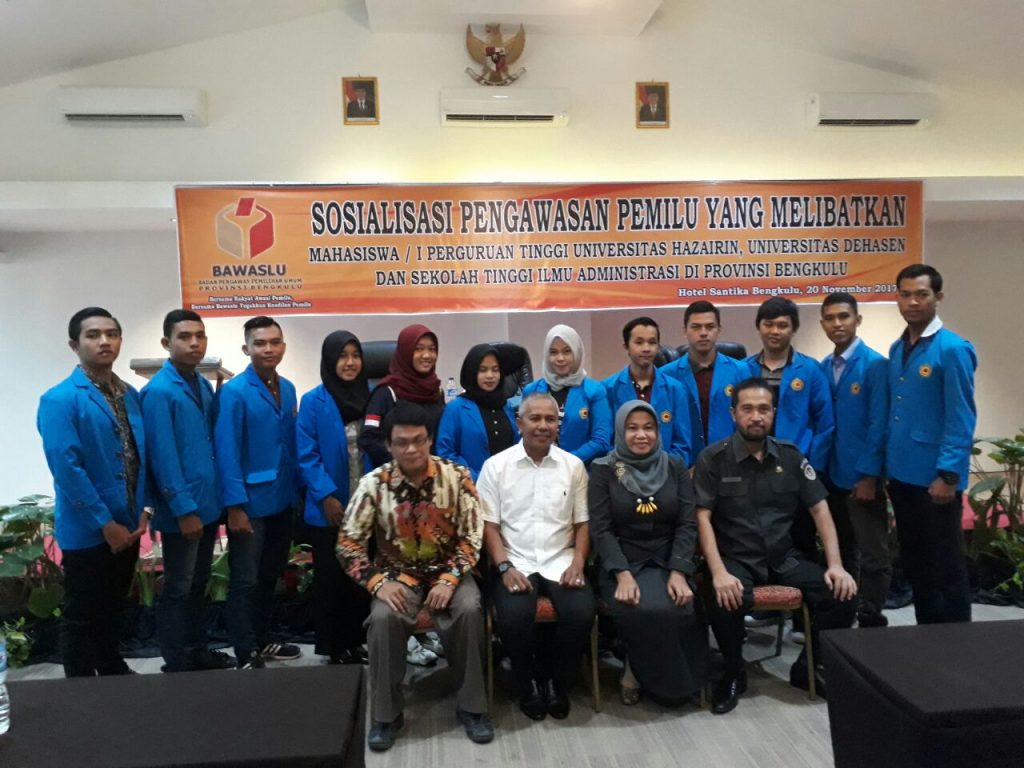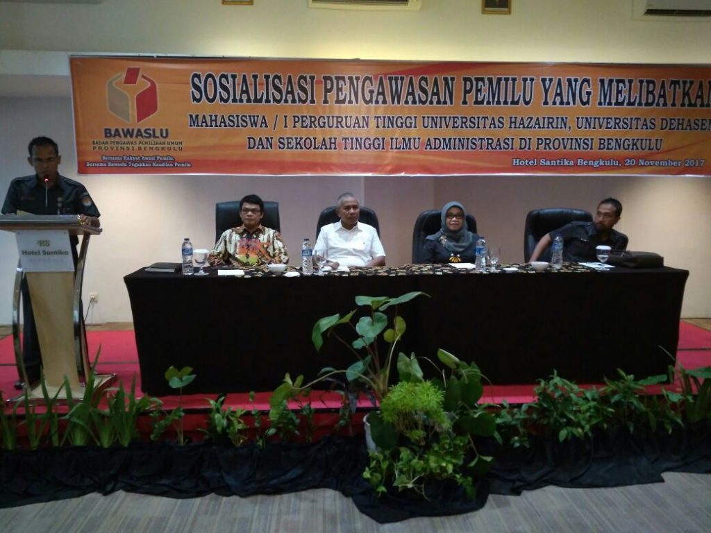 Bengkulu, Tanggal 20 November 2017 Bawaslu Provinsi mengadakan Acara Sosialisasi Pengawasan Pemilu Yang Melibatkan Perguruan Tinggi di Provinsi Bengkulu, acara ini di hadiri Peserta dari Universitas Perguruan Tinggi di Provinsi Bengkulu, yaitu Universitas Dehasen dan Universitas Hazairin, Acara di Buka Lansung Oleh Anggota Bawaslu Provinsi Bengkulu ibu Patima Siregar, M.pd, setelah pembukaan . lansung mengisi materi yang di sampaikan oleh Anggota Bawaslu Provinsi Bengkul dan Kepala Sekretariat Bawaslu Provinsi Bengkulu Serta Rektor Universitas Hazairin dan Wakil Rektor III universitas Dehasen.