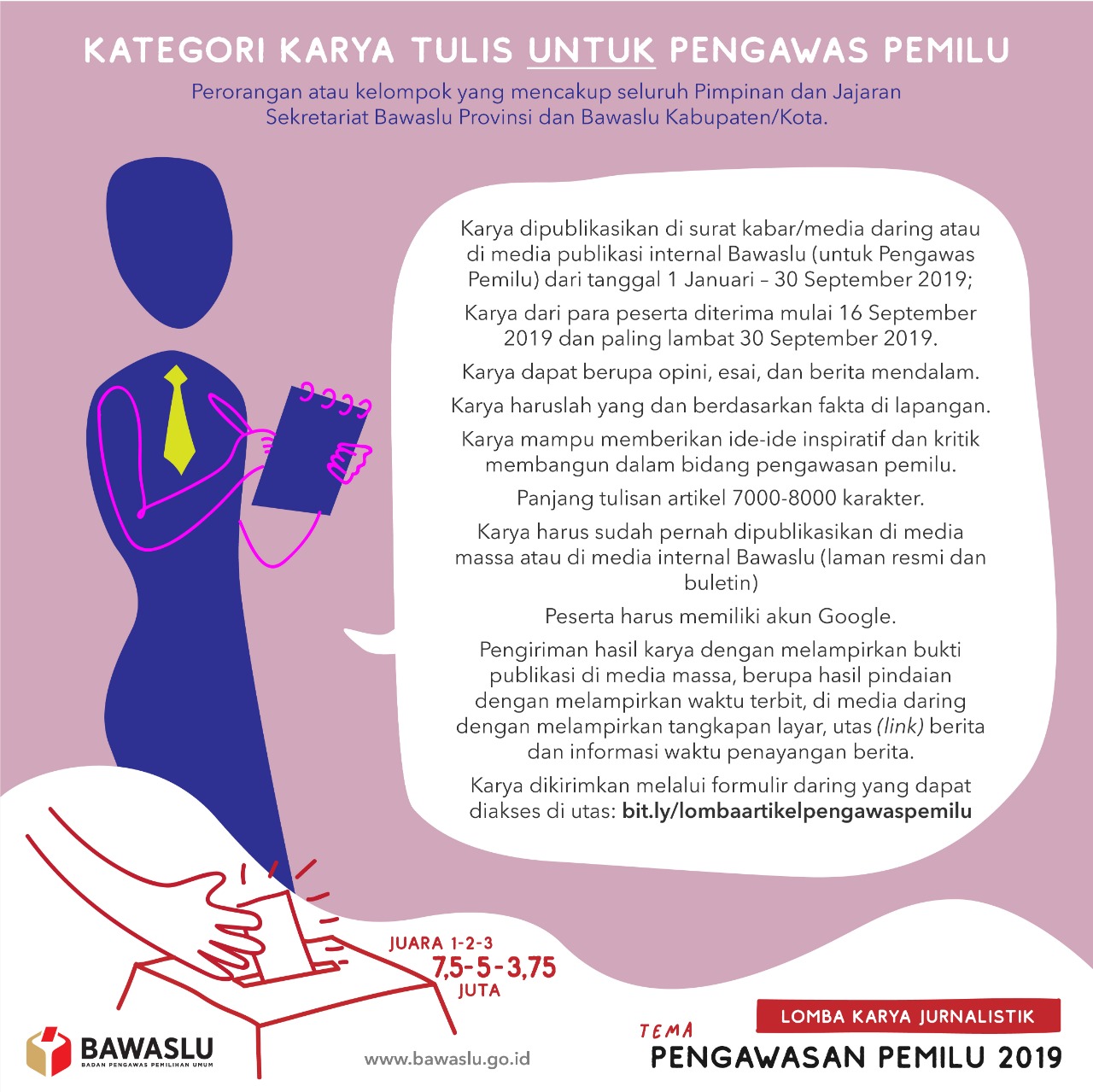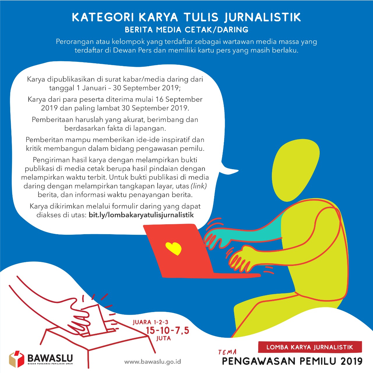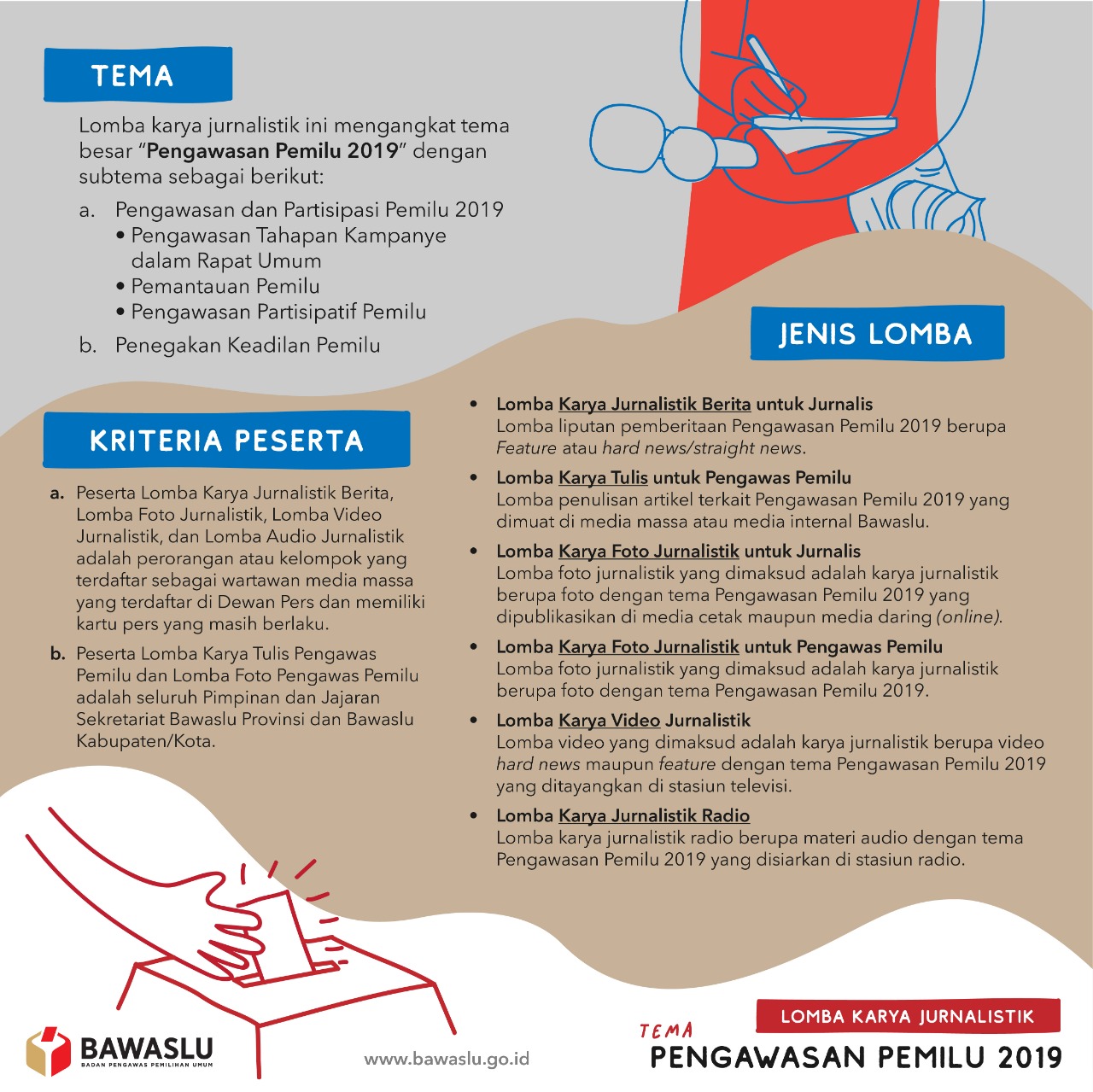 #SahabatBawaslu, ayo berpartisipasi dalam Lomba Karya Jurnalistik Pengawasan Pemilu 2019 Bawaslu. Lomba diselenggarakan untuk jurnalis dan pengawas pemilu.